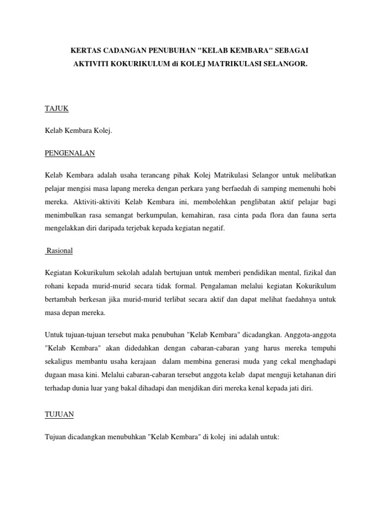 Kertas Kerja Kelab Kembara from imgv2-2-f.scribdassets.com Kertas kerja penubuhan briged bestari. Dalam konteks pendidikan kebangsaan, kegiatan kokurikulum merupakan satu program penting demi. Sk batu tellingai ,suai penubuhan kelab memanah 1. Contoh kertas kerja cadangan penubuhan persatuan bahasa melayu. Kertas kerja ini dikemukakan bertujuan seperti berikut: 2.0 pengenalan / latar belakang 2.1 pengenalan ringkas kelab… 2.2 sejarah/rekod … 2.3 bagaimana lahirnya idea utk menjalankan program ini. Contoh kertas kerja penubuhan taska contoh caps mp3 & mp4. Untuk makluman, ada 33 jenis perniagaan yang disediakan di dalamnya.