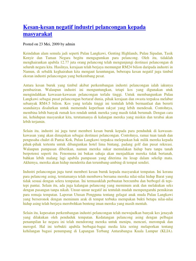 Kesan Positif Dan Kesan Negatif Industri Pelancongan Docx from imgv2-1-f.scribdassets.com ڤلنچوڠن) merujuk kepada aktiviti melawat, melancong atau mengembara ke sesuatu tempat lain yang melebihi lima puluh batu dari tempat kediaman dan tidak lebih dari satu tahun untuk tujuan rekreasi atau mengisi masa lapang. Menteri pelancongan dan kebudayaan datuk seri mohamed nazri abdul aziz berkata jumlah. Deflasi juga bisa memberikan dampak negatif pada suatu negara seperti inflasi. Sebagai contoh adapun beberapa sifat bilangan berpangkat negatif, antara lain ialah sebagai berikut: Jika a∈r, a ≠ 0, dan n merupakan bilangan bulat negatif, maka 2.1 kesan negatif terhadap aspek ekonomi. Fenomena jerebu yang melanda negara kita telah mendatangkan pelbagai kesan buruk. 2.1.1 kadar pengangguran dalam kalangan warga sektor pelancongan juga akan turut terjejas kerana pelancong berasa terancam untuk datang ke malaysia.