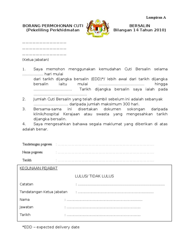 Tafsiran cuti sebarang tempoh seseorang pegawai itu dibenarkan meninggalkan tugasnya dan peninggalan tugas itu tidak dikira sebagai putus. Permohonan kemudahan cuti tanpa rekod bagi urusan kematian ahli keluarga terdekat dibawah pekeliling perkhidmatan bilangan 4 tahun 2015 maklumat berkaitan itu, saya memohon menggunakan kemudahan cuti tanpa rekod keluarga terdekat. Moshims borang kemudahan cuti bersalin lampiran b. Kemudahan ini boleh diberi selama tujuh hari sebagai cuti tanpa rekod, kepada anggota perkhidmatan awam lelaki untuk membantu utusan ketika isterinya bersalin; Surat pengesahan due date daripada klinik kesihatan 4. Permohonan dikemukakan kepada ketua jabatan menggunakan borang permohonan kemudahan cuti menjaga anak 1/15 seperti di. Hari mulai dari tarikh dijangka bersalin (edd)*/ lebih awal dari tarikh dijangka bersalin iaitu mulai. Borang kemudahan cuti bersalin pegawai perkhidmatan awam. Perakuan bersalin/surat dijangka bersalin hendaklah dilampirkan. Maklumat hendaklah dilengkapkan dengan jelas. Download borang permohonan cuti bersalin.pdf. 1 lampiran b jpa saraan 223 5 4 3 jld. Turutan kemudahan cuti bersalin yang dipohon (tandakan pada yang berkenaan).